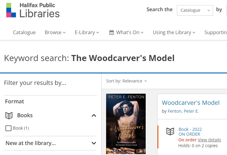 My first novel The Woodcarver’s Model continues to be well received with reviews continuing to come in. Another sign that the novel is gaining wider acclaim is the fact that libraries across Canada are beginning to purchase the book and make it available for readers free of charge.